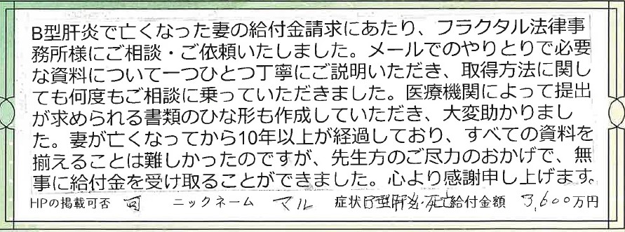 B型肝炎で亡くなった妻の給付金請求にあたり、フラクタル法律事務所様にご相談・ご依頼いたしました。メールでのやりとりで必要な資料について一つひとつ丁寧にご説明いただき、取得方法に関しても何度もご相談に乗っていただきました。医療機関によって提出が求められる書類のひな形も作成していただき、大変助かりました。妻が亡くなってから10年以上が経過しており、すべての資料を揃えることは難しかったのですが、先生方のご尽力のおかげで、無事に給付金を受け取ることができました。心より感謝申し上げます。
