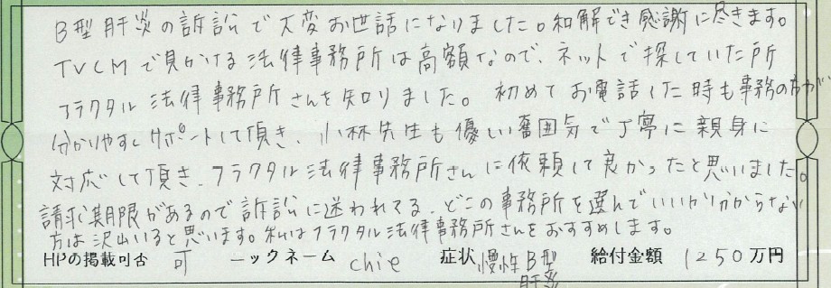 ニックネーム:chie様 症状:慢性B型肝炎 給付金額:1250万円