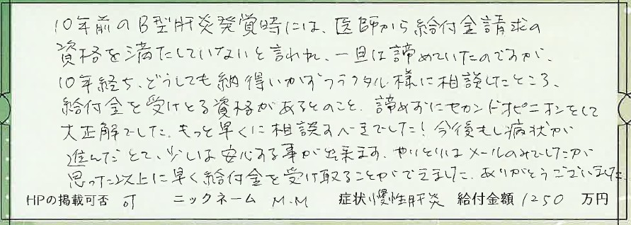 ニックネーム:M.M様 症状:慢性肝炎 給付金額:1250万円
