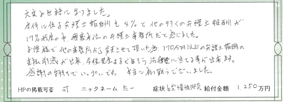 お蔭様で他の事務所から変更させて頂いた為、170万円以上の弁護士報酬の支払削減が出来、今後発生するであろう治療費に当てる事が出来ます。